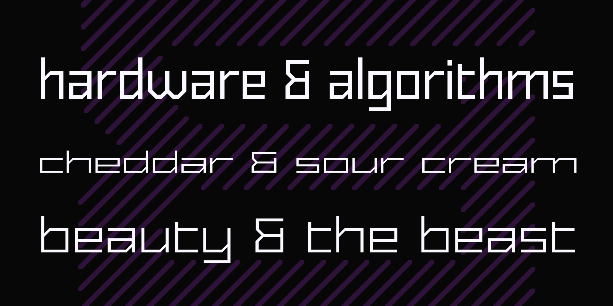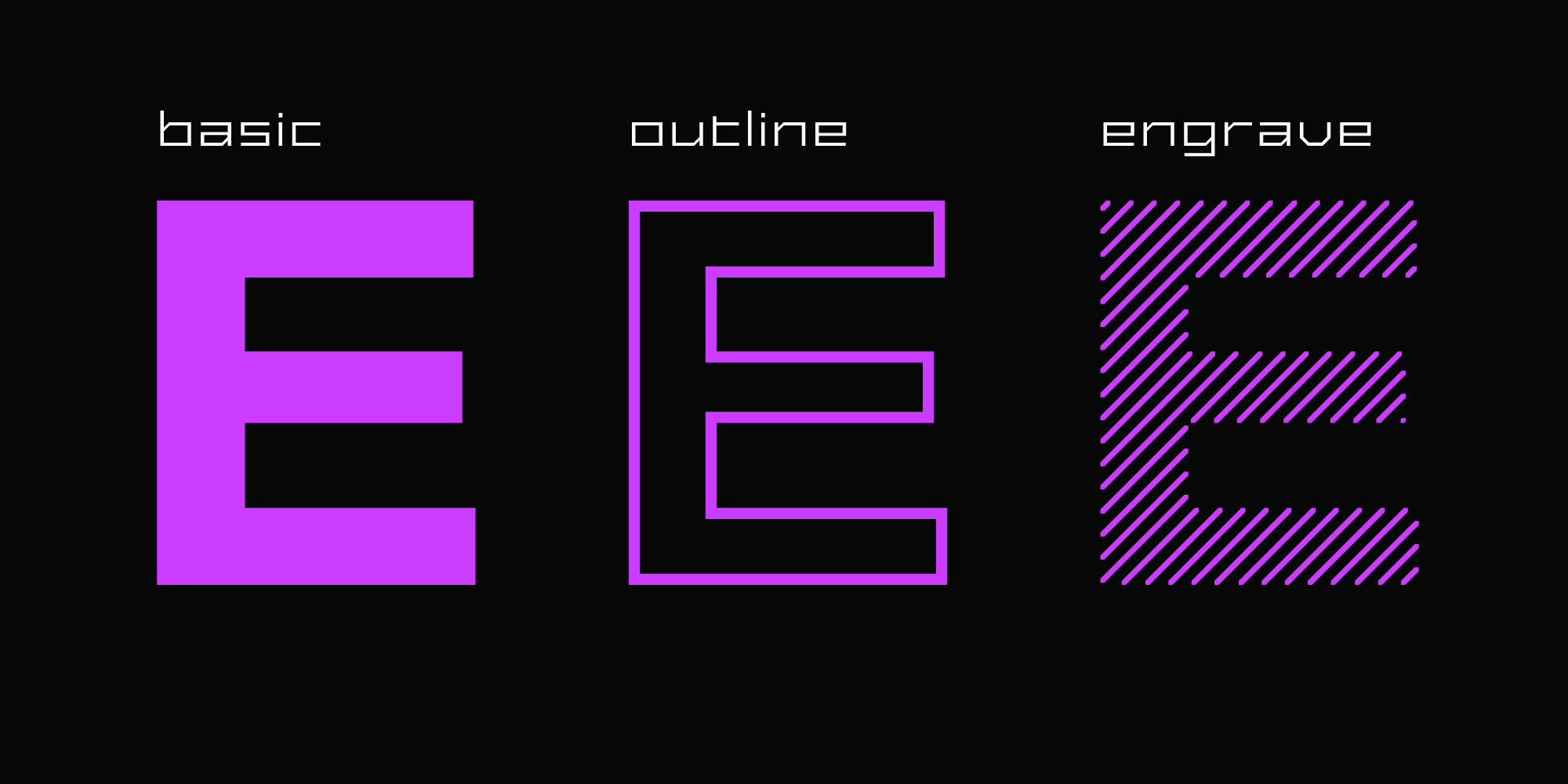 Exabyte is a modular display sans-serif prevailed by 90º angles. Its 63 plain styles consist of 7 widths and 9 weights. Each heaviest weight also comes in Outline and Engrave styles (non-layerable) in all 7 widths, bringing the overall style count to 77.