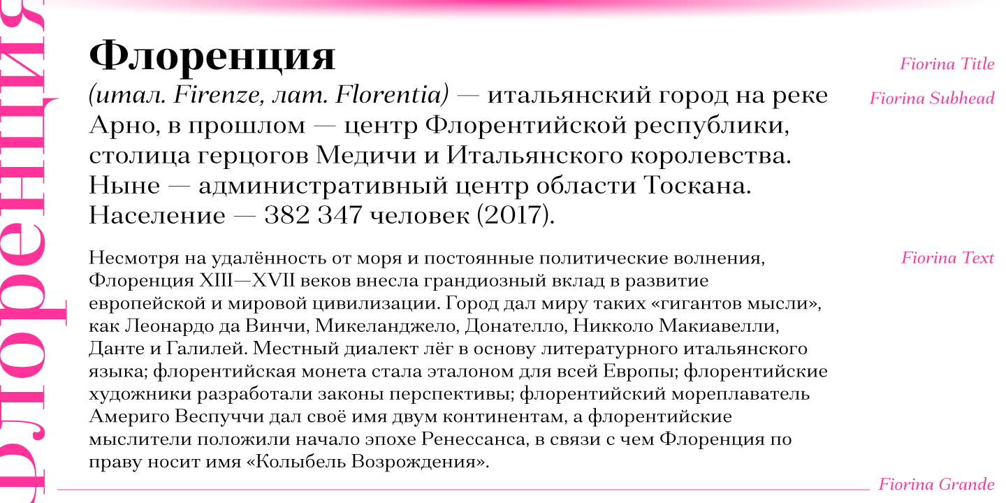 Fiorina is a modern Didone-style serif typeface of 72 fonts. It comes in 4 optical sizes, ranging from Text with moderate contrast to super-contrasted Grande,
