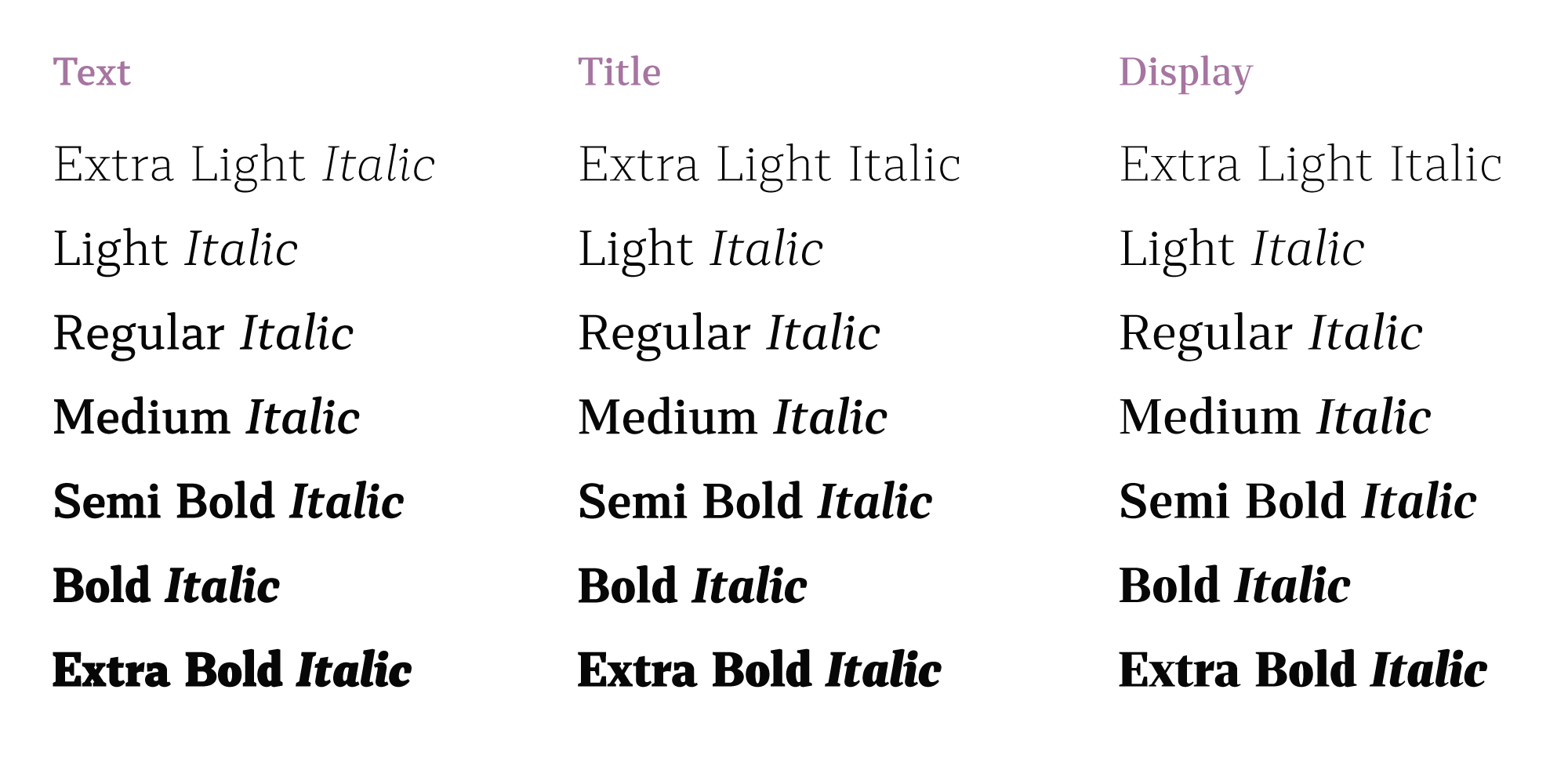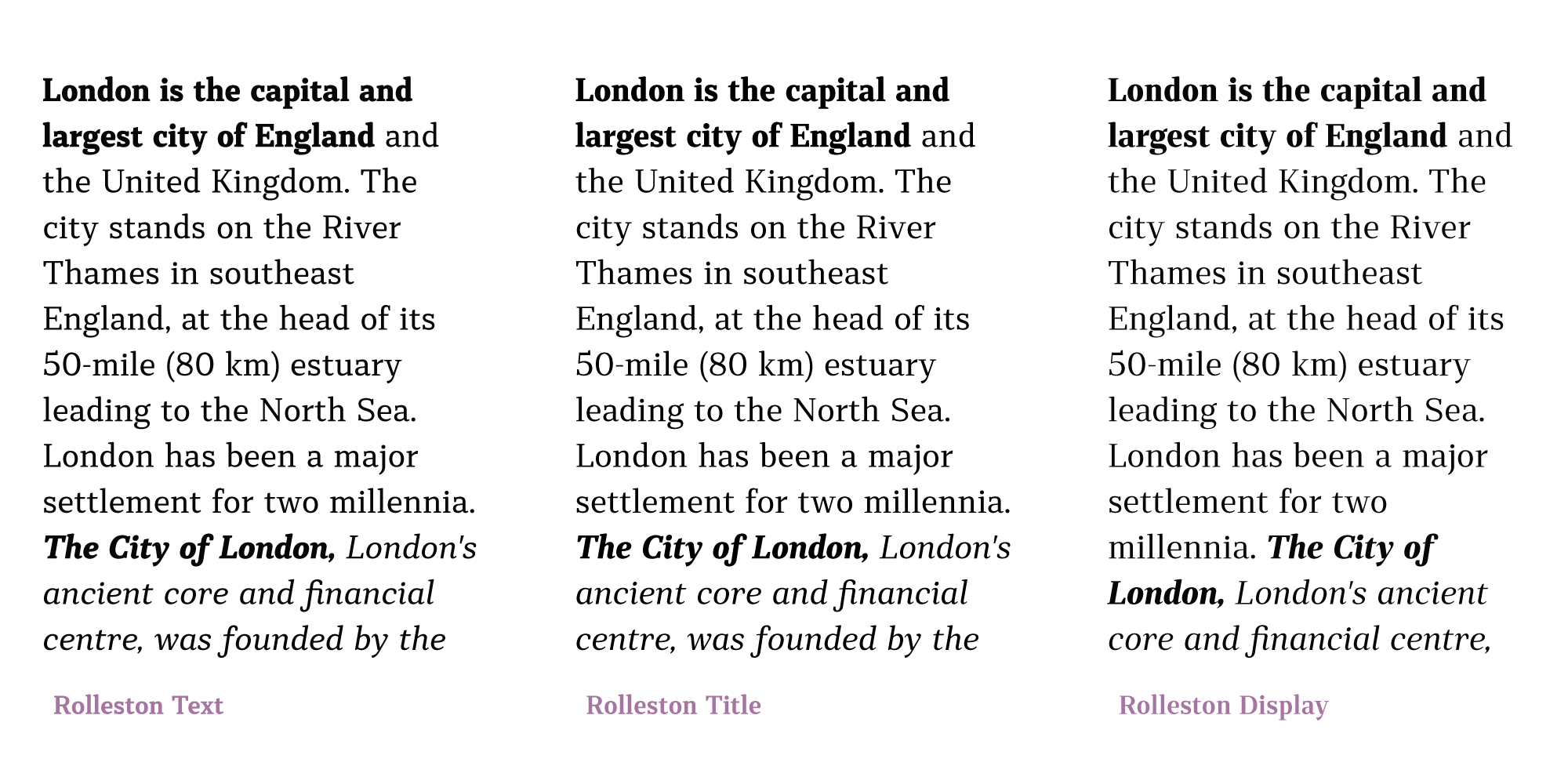 Rolleston is a rigid 42-style serif font family with peculiar spiky serifs. It goes in three optical sizes, Text, Title, and Display.