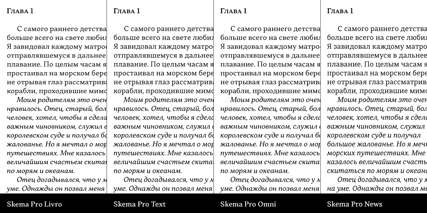 Skema Pro is a versatile system of 6 serif typefaces - each bearing a distinct character and purpose. Together they form a huge superfamily of 84 fonts to fit any imaginable task.